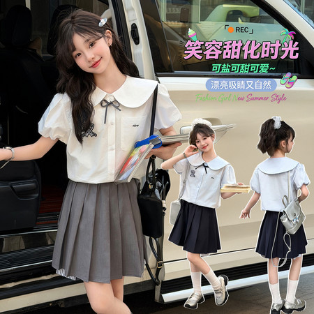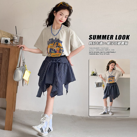 亿棵树童装&Q1621格子上衣牛仔裙套装