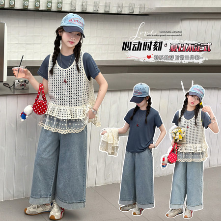 时尚芭蕾童装&26A11花边上衣牛仔裤三件套